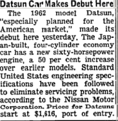 Japonya’nın ilk ihracat kalemi, el radyoları ve saatlerdi. ABD’de 1960’larda Japon ürünleri, tıpkı Türkiye’de 2000’lerde Çin malı ürünlerin karşılandığı gibi karşılanmıştı: ucuz, basit, kolay kırılır, yenisi kolay alınır. 1970’lere gelindiğinde ilk Japon otomobilleri ABD’ye ihraç edilmeye başlanmıştır. Türkiye’de pek bilinmeyen Datsun, bu konuda öncü olacaktır. Daha sonra Nissan adıyla tanıyacağımız Datsun, ilk defa 1962 modellerini ihraç eder.
