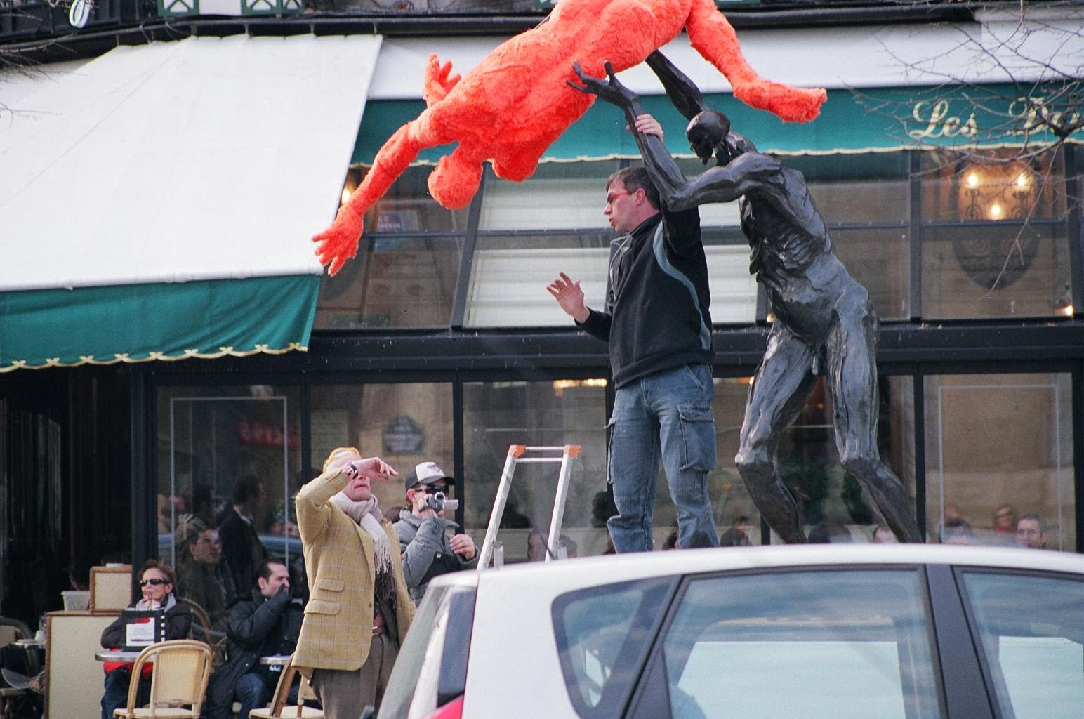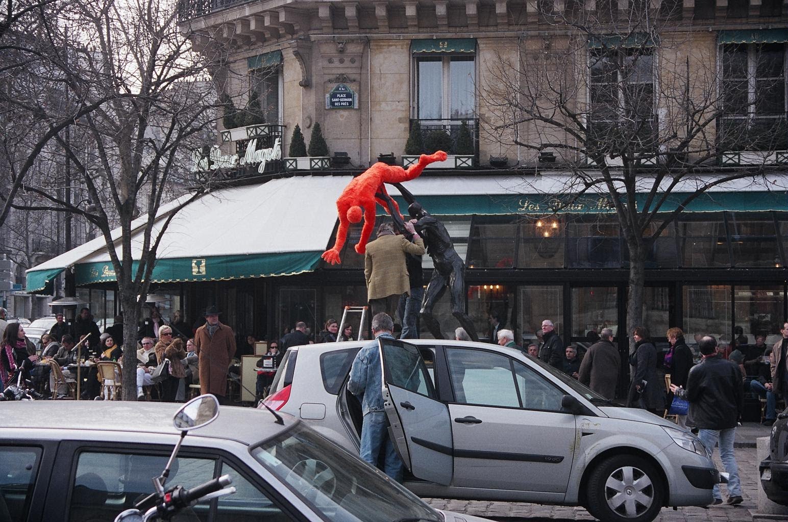 Saint-German-des-pres olduğunu şimdi tekrar baktığımda öğrendiğim mahallede yürürken hem Barok-Gotik heykellerin üzerinde, hem de yolun dört bir yanında yayılmış enstelasyonlar epeyce ilgimi çekmişti. Les Deux Magot’yu bu satırları yazana kadar iki kurtçuk olarak biliyordum, az önce sağolsun o zamanlar olmayan -fotoğraf karesi 2006 yılından- Google’dan iki Çin figürü demek olduğun öğrendim.
