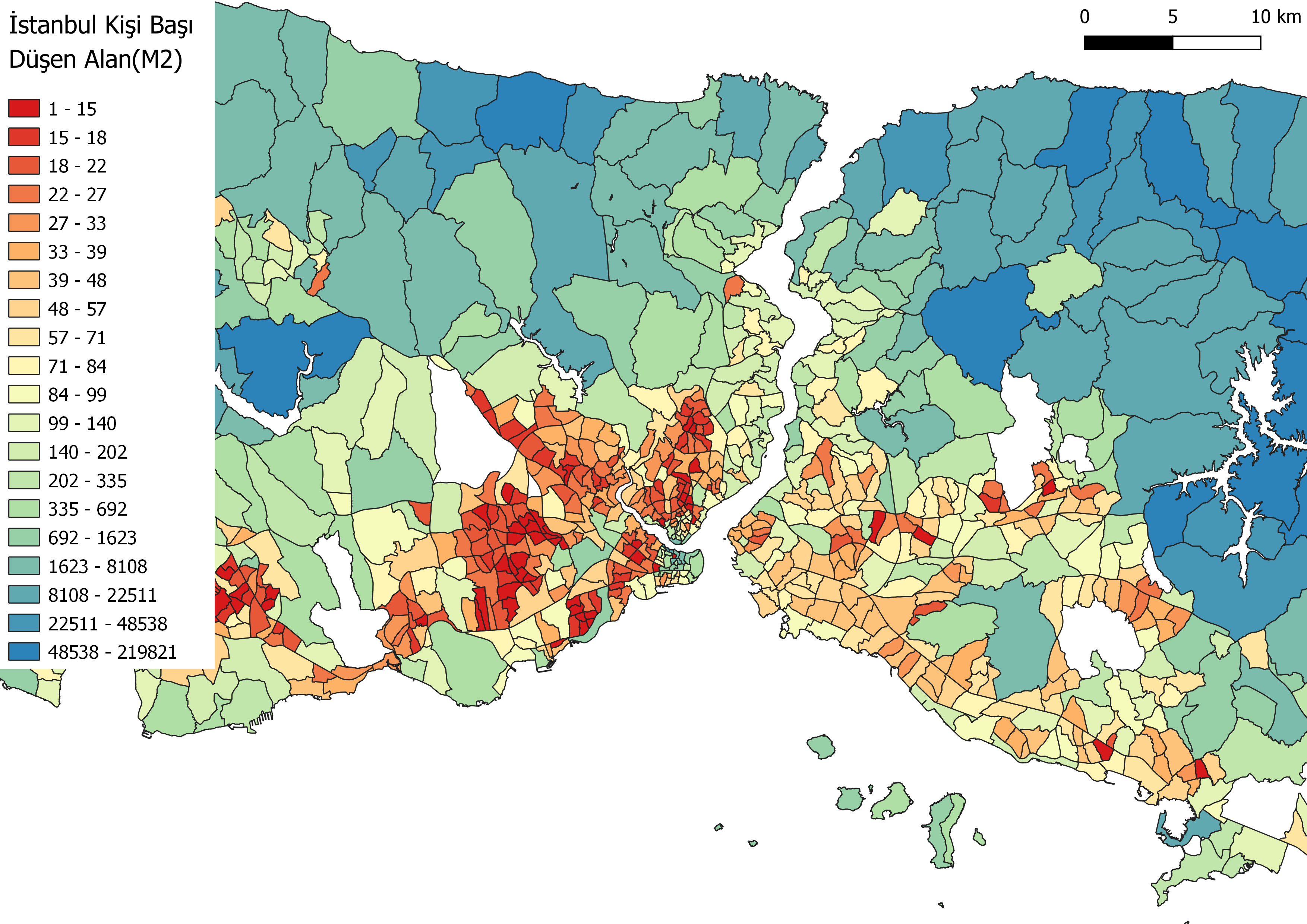 Her mahallenin kilometrekare büyüklüğünde olmasına imkân olmadığını biliyorsunuz. Hoş, Çekmeköy’ün Parseller mahallesi tam bir kilometrekare büyüklüğünde ve 15bin kişi yaşıyor. Bir de, kişibaşı kaç metrekare düştüğüne bakarsak, benim Gaziantep’in çöküntü alanları için aşırı bulduğum yoğunluğun -kişibaşı 10 metrekare- İstanbul’da vakay-ı âdiyeden sayıldığını görebiliriz.